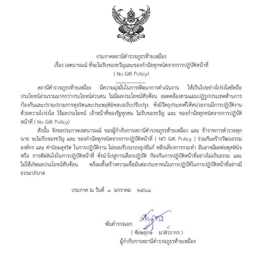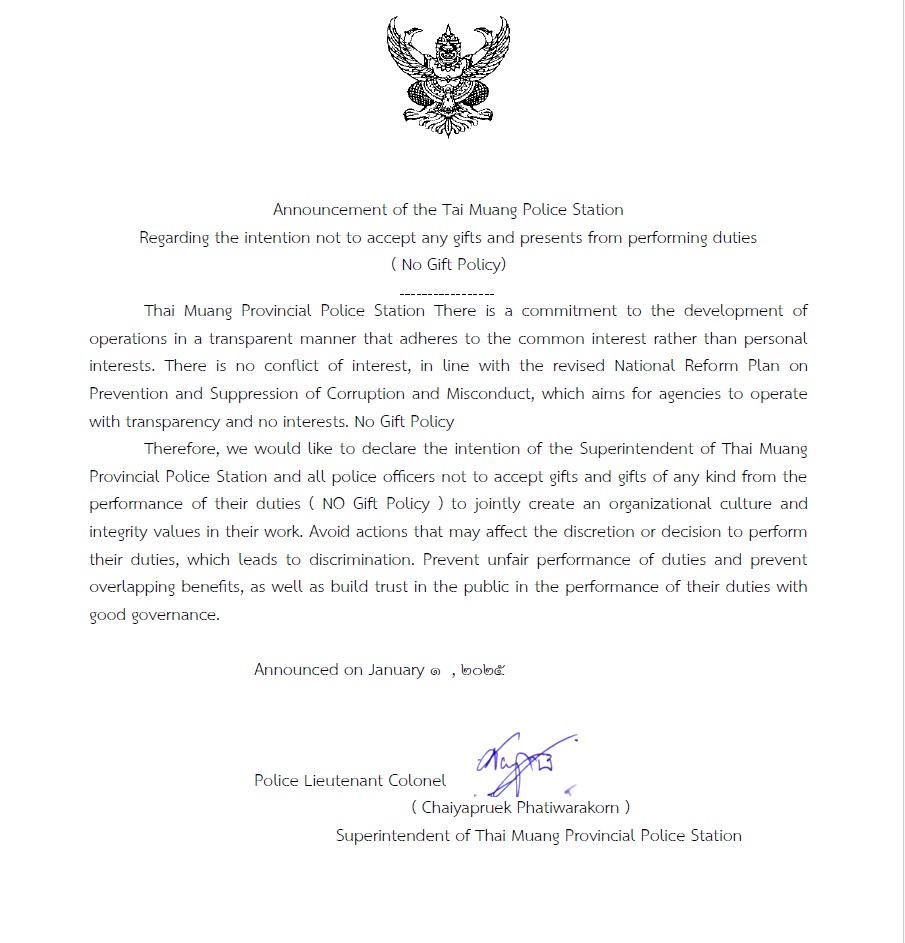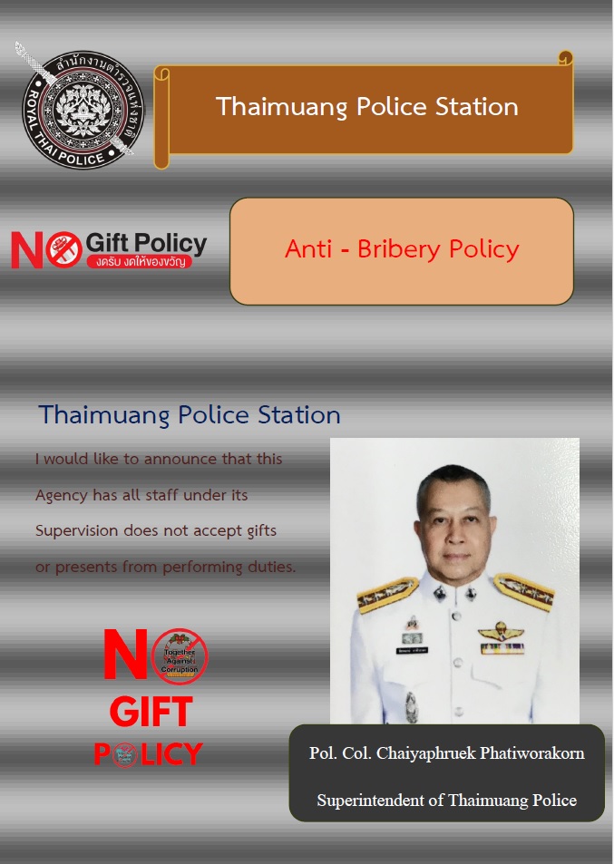 ไม่รับของขวัญและของกำนัลทุกชนิด (์No Gift Policy) จากการปฏิบัติหน้าที่